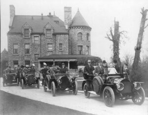 Auf diesem Foto von 1908 ist die Südseite von Tippecanoe Place zu sehen, dem großen Haus in South Bend, das Clement Studebaker 1889 errichten ließ. Im Vordergrund sind vier Automobile mit einigen Mitgliedern des Studebaker-Clans zu sehen, darunter J.M. Studebaker, der im rechten hinteren Teil des vorderen Wagens sitzt.