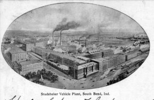 Die Studebaker-Fahrzeugfabrik in South Bend wird um 1905 gezeigt. Dieses Bild war auf der Vorderseite einer Postkarte aus dem frühen 20. Jahrhundert, die von der South Bend Tribune gedruckt wurde.