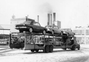 Als sich das Jahr 1963 dem Ende zuneigt, verlässt auf diesem Foto vom Dezember 1963 die letzte Lieferung von in South Bend hergestellten Studebakern das Werk.